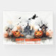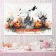 Halloween-Banner mit einem Spuk Haus, das mit einem klassischen Kürbisweiler-Jack O'Lantern und einer bösen Hexe bestückt ist. Dieses Halloween-Banner zeigt eine Spuk Hausszene, neben einem geschnitzten Kürbis - auch als Jack O'Lantern bekannt - und der Hexenfigur.