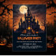 Diese Halloween-Einladung setzt einen Zauber mit seiner moodisch-gotischen Burgszene, die im Mondschein gebadet wird und von glühenden Jack-o'-Laternen und verwinkelten Bäumen umgeben ist, die einen ganz unheimlichen Ton Set haben. Das Design verwendet eine Mischung aus Schriftart, um das Drama zu vergrößern: eine kühne, bedrängte Serife für den Veranstaltungstitel, der Vintage Horror-Vibes kanalisiert; ein skurriles, handgeschriebenes Skript für die Slogline, die spielerischen Flair hinzufügt; eine saubere Sans-Serif für die Details des Party, um Dinge lesbar zu behalten; und eine stylisierte Großserife für das Datum, das sich zeremoniös und ein wenig ominös anfühlt. Die geschichtete Typografie spiegelt den visuellen Rhythmus wider - spukhaft, frech und unverkennbar festlich.