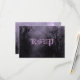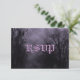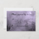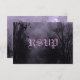 Eine individuelle RSVP-Kartenvorlage mit grungy Schrift und traditionell gotischen Buchstaben auf einem spöttischen Halloween-Himmel mit mistigen Bäumen an einer dunklen Spuk Straße, Raben und einem bewölkten Vollmond und einem lila Farbton. Klicken Sie auf Anpassen, um Schriftart, Größen und mehr zu ändern, sogar Ihr Design für später retten.