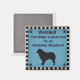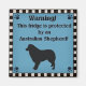 "Warnung! Dieser Kühlschrank wird von einem australischen Schäferhund geschützt!" Mit einer Silhouette eines australischen Hirten auf blauem Hintergrund, umgeben von einem schwarz-weiß karierten Rahmen und schwarzen Pfoten in jeder Ecke.