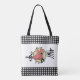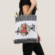 Square Dancing Couple in Red Karo Outfits mit einem musikalischen Symbol hinter ihnen und Schwarz-Weiß-Karo-Trimm am oberen und unteren Rand der Tasche.