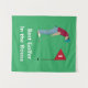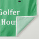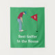 Golfer, mit einer Kappe, tiefrotes Shirt und blaue Hosen, die einen Golfball in ein Loch-Stein-Design stecken. Fügen Sie Ihren eigenen Text hinzu.