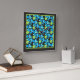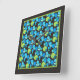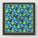 Eine hübsche, quadratische Wall-Uhr mit einem abstrakten "Blue Moons"-Muster in heller Blues und Neon-Grün auf schwarzem Hintergrund; von Judy Adamson aus einer handbemalten Papiercollage.
