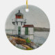 Squirrel Point Lighthouse sits on the banks of the Kennebec River in Maine on a dark misty day. The opposite bank near Phippsburg is shrouded in fog. Lichen grows on the bell house roof and the rocks in the foreground. New spring grass springs up around the brush still bare from the long winter. Sargassum laps against the rocky shore showing how close the lighthouse is to the water.
