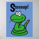 Der sonnige grüne Cartoon ratscht Schlange. Er hat große ovale Augen mit erhöhten Augenbrauen. Ein wahnhaftes Grinsen, dessen Zunge sich herausklemmt. Sein lang gekochter Körper hat einen Klappern auf der Spitze seines Schwanzes. Über der Schlange in der schwarzen Schrift ist ein Stück auf dem Wort Sup! Lesen Sssssup!