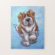 Tier Parade Cute St. Bernard Dog Puzzle with Gift Box Created by Stell That! Design feature our cute tan and white dog character standing in a grassy yard with a red brick fence, a textured blue sky and a playful wavy purple border painted by talented children's book artist, Traci Van Wagoner. The fun pup stände in play position with one paw raised. This fun pet art is perfect for St. Bernard dog lovers and humorous animal art art lovers of all ages. Wir many of our whimsical St. Bernard doggy products you'll find this cute puppy coming and going with the playful Saint Bernard dog's head on one side and the funny dog's tail on the other. Join the Animal Parade and bring a smile to the face of someone you love with a gift of our cute St. Bernard dog. Woof!