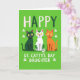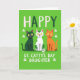 Diese Karte zeigt drei stilisierte Katzen, die auf einem hellen Limettengrün im Vordergrund aufgereiht sind und der ganzen Szene ein festliches St. Patrick’s Day-Aussehen verleihen. Eine Katze ist smaragdgrün, die nächste ist weiß mit grünen kleeblattähnlichen Flecken und die dritte ist eine rot getigerte Katze, die alle ordentlich nebeneinander sitzen, als ob sie zusammen posieren würden. Ihre gelben Augen und kleinen rosa Nasen verleihen ihnen einen neckischen Charme, und die herausschauenden kleinen weißen Fangzähne lassen sie aussehen, als ob sie mit dem Betrachter einen Insiderwitz teilen. Der feste, frontale Blick der Katzen fühlt sich wie ein freundlicher Stups an, der nur für eine Tochter bestimmt ist, wobei die enge Anordnung des Trios eine gemütliche, liebevolle Bindung suggeriert. Oben steht "HAPPY" in abwechselnd dunkelgrünen und weißen Buchstaben, gleichmäßig über ihren Köpfen verteilt. Unten erscheint "ST. CATTY'S DAY DAUGHTER" in großen weißen Buchstaben, zentriert und leicht lesbar, mit