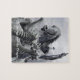 St George sitzt rittlings auf seinem trusty Steed und richtet gegen die schneidenden Talons des Furcht erregenden Drachen auf. St George betrachtet unten dem Drachen und gut erwägt, wie man das Tier tötet.