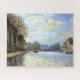 Aussicht auf den Canal Saint-Martin in Paris . Alfred Sisley. Niedliche Frühlingslandschaft in Blautönen. Fluss mit fließendem Wasser. Es gibt eine Stadt am Ufer des Flusses. Bäume wachsen auf dem Damm. Lichtwolken laufen über den Himmel. Reproduktion berühmter Kunstbilder im öffentlichen Bereich.