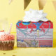 Elegantes, klassisches Design auf Pergament mit antiken florentinischen Blumenmotiven und einem glänzenden 3D-blauen Saphir-Edelstein aus dem italienischen mittelalterlichen Miniatur aus San Miniato, Toskana