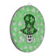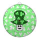Ein Cartoonpilz mit Kleeblattstellen auf einer grünen Kappe. Der Hintergrund ist mit einem weißen Kleeblattmuster hellgrün.
