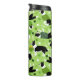 Niedliche St. Patrick's Day Border-Colliese in vielen Grüntönen mit gestreiften und herzzerreißenden Pullover mit verstreuten Vierblatt-Kleeblatten und Hundeknochen auf grünem Hintergrund.