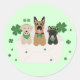 Drei Hunde, die aus einem Brief herauskommen, umgeben von glücklichen vierblättrigen Nelken. Ideal für St. Patrick's Day.