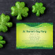 Diese magische, funkelnd Einladung zum St. Patrick's Day zeigt wunderschöne Sterne, die um das hübsche grüne Band entlang der Grenze schweben. Das dunkelgrüne Rücken wird mit einem vierblättriges Kleeblatt für eine lustige Touch betont. Diese elegante Einladung eignet sich hervorragend für einen lustigen Festabend mit St. Patricks Day-Festen, wo Sie trinken und feiern, oder für ein stilvolles Abendessen mit Ihren irischen Freunden.