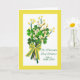 St. Patrick's Day wünscht! Für eine liebe Tante, Papier Grußkarte. Gerahmt in hellgelber Farbe mit einem Blumenstrauß aus gelben Forsythia-Federn, Katkins und Nelken in verschiedenen Grüntönen. Foto eines Frühjahrsbogens mit gelben Streifen und weißen Polka-Punkten. Art, Bild und Vers Copyright © Shoaff Ballanger Studios, 2021.