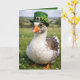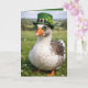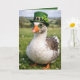 Eine Gans mit einem kleinen St. Patrick's Day-Hut mit einem Vierblattklee und einer Brille steht auf einem grasbewachsenen Feld unter einem klaren Himmel.