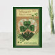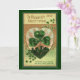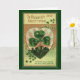 Bereits im 17. Jahrhundert wurden zum St. Patrick's Day grüne Bänder und Kleeblätter getragen. St. Patrick soll das Kleeblatt, eine dreistufige Pflanze, benutzt haben, um dem vorChristlichen Irischen die Heilige Dreifaltigkeit zu erklären, und das Tragen und Anzeigen von Kleeblättern und von Kleeblatt inspiriert Designs sind zu einem allgegenwärtigen Merkmal des Tages geworden. Der Begriff "das Tragen des Grüns", also das Tragen eines Kleeblatts auf der Kleidung, leitet sich vom gleichnamigen Lied ab. Vintage Collage zur Ehrung des St. Patrick’s Day. Der Text vor der Karte ist Teil der Originalvorlage und kann nicht entfernt werden.
