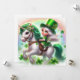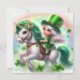 Niedliches St. Patrick's Girl, das einen Koboldhut trägt, der auf einer magischen Einhornkarte mit Regenbogen und Nelken sitzt, Freude spreizen, jubeln, alles fröhlich und immer glücklich machen! Weihnachtskarten, die das ganze Jahr aufhellen.