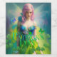 Digitales ai Kunstwerk einer irischen St Patrick's Day Fee mit einem grünen und blauen Kleid mit drei Blatt Klee und Schmetterlinge.