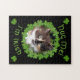 Niedliches grünes mit Augen Calico Kätzchen umgeben von vier Blätterklebern. Umarme mich, ich bin Irin. Dieser Text kann in der Vorlage personalisiert sein. Freuen Sie sich auf fröhliche grüne Kleeblätter und positive Lebensbilder für Katz- und Rätsel-Liebhaber jeden Alters. Viel Spaß! Original Fotografie und Design von Anura Design Studio.
