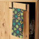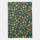 Niedliches St. Patrick's Day Küchentuch in festlich grün, orange, gelb und schwarz mit einem lustigen, verrückten Muster von vierblättriges Kleeblatt Kleeblättern, glücklichen Hufeisen, Kobobolden, grünem Bier und orangefarbenen irischen Küssen.