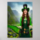 Eine junge Dame mit roten Haaren, die grüne Kleidung trägt und draußen mit Berg im Hintergrund stehend ist. Das ist eine künstlerische KI.