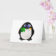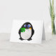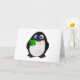 Ein niedlicher Pinguin, der ein großes grünes Kleeblatt in seinem Schnabel trägt.