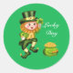 St. Patrick's Day Glück Kobold, Kleeblatt & Topf Gold auf grünem Aufkleber. Text kann personalisiert sein.