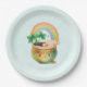 Papier Teller mit einer anmutigen Abbildung mit einem lächelnden grünen und goldenen Topf mit einem niedlichen Regenbogen, einer glücklichen Wolke und einem grünen Klee.