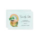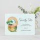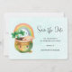 Save the Date Karte mit einer anmutigen Abbildung mit einem lächelnden grünen und goldenen Topf mit einem niedlichen Regenbogen, einer glücklichen Wolke und einem grünen Klee.
