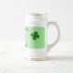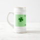 Niedliche Kleeblätter auf hellgrünem Hintergrund, auf einem Bierstein für St. Patrick's Day Geburtstage. Der Text lautet: "St. Patrick's day is my year!" Der Text kann leicht geändert werden.