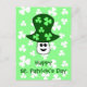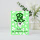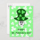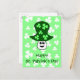Ein Cartoon-Pilz mit einem grünen Oberteil in Form eines Kobelhutts. Die Kappe hat Kleeblatt Flecken. Der weiße Stiel lächelt. Der Hintergrund ist blassgrün mit einem weißen Kleeblatt. Es steht "Happy St. Patrick's Day" auf der Vorderseite.
