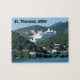 Einzigartige Aussicht auf den St. Thomas mit seinen blauen karibischen Gewässern und einem großen Kreuzfahrtschiff, das direkt über den Hügeln der Insel liegt.
