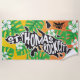 St. Thomas "Rock City" Tropical Tote Tag Tropical, festliche Farben. Tropische Blume und Blätter umgeben die Form von St. Thomas, US Jungfrau Islands. St. Thomas ist Teil der US Jungfrau Islands in der Karibik.