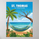 Eine gestreifte Hängematte hängt von einem Palmenzweig über einem Sandstrand mit Ozean und Himmel im Hintergrund.