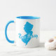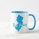 Zeigen Sie Ihren Zuhause-Staatsstolz mit diesen T - Shirt und anderen Artikeln, die eine blaue Kontur des Staat von New Jersey mit dem Namen in der Form haben.