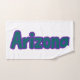 Dieses Handtuch ist ein Design, das das Wort "Arizona" in einem Boldoa-Schriftart zeigt und lila, türkisfarbene Buchstaben in türkisfarbener Kontur in diesem individuellen Staatsstolz-Jersey-Stil. Dieses Handtuch ist mit einer Polyester-Mischung Vorderseite, während die Rückseite ist 100% Baumwolle alle Handtücher verwenden Sublimation/lebhaften Druck, die entwickelt wurde, um zu halten.
