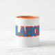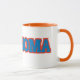 Diese individuelle Kaffeemaschine-Tasse zeigt das Wort "Oklahoma" in einem Boxdruck-Schriftart mit aqua blauen Buchstaben, orange Kontur in diesem benutzerdefinierten Staatsstolz Jersey-Stil. Die Felgen & Griffe sind in passenden Farbtönen in Mikrowellen- und Geschirrspüler-Keramik in 11 Unze- oder 15 Unzen-Größen erhältlich.