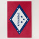 Dieses Design ist mit der Fahne von Arkansas ausgestattet, einem Staat im südlichen Zentralgebiet der Vereinigten Staaten. Die vielfältige Geografie des Staat reicht von den bergigen Regionen des Ozarks und der Ouachita, aus denen das Innere Hochland der USA besteht, bis hin zu dicht bewaldetem Land im Süden, bekannt als Arkansas Timberlands, zu den östlichen Tiefen entlang des Mississippi Flusses und dem Arkansas Delta. Die Hauptstadt und die größte Stadt von Arkansas ist Little Rock. Der Spitzname von Arkansas ist der "natürliche Staat", aber er war früher als der "BärenStaat" bekannt. Die Fahne von Arkansas besteht aus einer großen blauen, weißen Lozenge oder Diamant auf einem roten Hintergrund; der Name des Staat ist in der Mitte eingetragen.