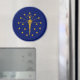 Dieses Design zeigt die Staatsflagge von Indiana, ein US-Staat in den Regionen Mittelwesten und Große Seen in Nordamerika. Sie grenzt im Nordwesten an den See Michigan, im Norden an Michigan, im Osten an Ohio, im Süden und Südosten an den Ohio River und Kentucky sowie im Westen an den Wabash River und Illinois. Indiana wurde am 11. Dezember 1816 als 19. Staat in die Vereinigten Staaten aufgenommen. Die Flagge Indianas wurde von Paul Hadley entworfen und 1917 vom Staat Indiana offiziell adoptiert. Die Fahne besteht aus einer goldenen Fackel, die Freiheit und Erleuchtung repräsentiert; die Strahlen um die Fackel stellen ihren weit reichenden Einfluss dar. Die neunzehn Sterne repräsentieren Indianas Platz als der neunzehnte Staat, den Vereinigten Staaten beizutreten. Die dreizehn Sterne im äußeren Kreislauf symbolisieren die ursprünglichen dreizehn Kolonien, die fünf inneren Sterne repräsentieren die nächsten fünf Staaten, die der Gewerkschaft hinzugefügt werden, und der eine große Stern über der Fackel repräsentiert Indiana. Die Hauptstadt Indiana ist Indianapolis, die auch die größte Stadt des Staat ist. Weitere wichtige Städte in Indiana sind Fort Wayne, Evansville, South Bend, Carmel, Fishers, Bloomington, Hammond, Gary, Lafayette, Muncie, Noblesville, Terre Haute, Greenwood, Kokomo, Anderson, Elkhart, Mishawaka und Lawrence.