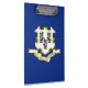 In diesem Design ist die Flagge von Connecticut zu sehen, dem südlichsten Staat in der Region Neuengland im Nordosten der Vereinigten Staaten. Es grenzt im Osten an Rhode Island, im Norden an Massachusetts, im Westen an New York und im Süden an Long Island Sound. Nach den meisten Quellen ist es Teil von Neuengland, obwohl große Teile von ihm häufig mit New York und New Jersey als Tri-Staat-Gebiet gruppiert sind. Der Staat ist nach dem Fluss Connecticut benannt, der den Staat ungefähr halbiert. Der Name "Connecticut" leitet sich von dem Wort "Mohegan-Pequot" für "Long Tidal River" ab. Der offizielle Spitzname von Connecticut ist der "Verfassungs-Staat", aber auch bekannt als der "Nutmeg-Staat", der "Provisions-Staat" oder das "Land der beständigen Lebensräume". Das lateinische Motto lautet "Qui transtulit sustinet", d.h. "Wer sich transplantiert hat, erhält". Die Fahne des Staat von Connecticut enthält einen barocken Schild mit drei Weinreben, die jeweils drei lila Trauben auf einem königsblauen Feld tragen. Die Hauptstadt von Connecticut ist Hartford und die bevölkerungsreichste Stadt des Staat ist Bridgeport. Weitere wichtige Städte in Connecticut sind New Haven, Stamford, Waterbury, Norwalk, Danbury, New Britain, Bristol, Meriden, West Haven und Milford.