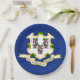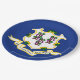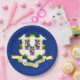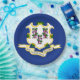 In diesem Design ist die Flagge von Connecticut zu sehen, dem südlichsten Staat in der Region Neuengland im Nordosten der Vereinigten Staaten. Es grenzt im Osten an Rhode Island, im Norden an Massachusetts, im Westen an New York und im Süden an Long Island Sound. Nach den meisten Quellen ist es Teil von Neuengland, obwohl große Teile von ihm häufig mit New York und New Jersey als Tri-Staat-Gebiet gruppiert sind. Der Staat ist nach dem Fluss Connecticut benannt, der den Staat ungefähr halbiert. Der Name "Connecticut" leitet sich von dem Wort "Mohegan-Pequot" für "Long Tidal River" ab. Der offizielle Spitzname von Connecticut ist der "Verfassungs-Staat", aber auch bekannt als der "Nutmeg-Staat", der "Provisions-Staat" oder das "Land der beständigen Lebensräume". Das lateinische Motto lautet "Qui transtulit sustinet", d.h. "Wer sich transplantiert hat, erhält". Die Fahne des Staat von Connecticut enthält einen barocken Schild mit drei Weinreben, die jeweils drei lila Trauben auf einem königsblauen Feld tragen. Die Hauptstadt von Connecticut ist Hartford und die bevölkerungsreichste Stadt des Staat ist Bridgeport. Weitere wichtige Städte in Connecticut sind New Haven, Stamford, Waterbury, Norwalk, Danbury, New Britain, Bristol, Meriden, West Haven und Milford.
