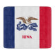 Dieses Design besticht durch die Staatsflagge von Iowa, einem Staat im Mittleren Westen der Vereinigten Staaten, der östlich vom Mississippi und westlich vom Missouri und Big Sioux-Fluss grenzt. Es grenzt an sechs weitere Staaten: Wisconsin im Nordosten, Illinois im Osten und Südosten, Missouri im Süden, Nebraska im Westen, Süddakota im Nordwesten und Minnesota im Norden. Der Staat wird manchmal als "Hawkeye-Staat" bezeichnet. Die Staatsflagge von Iowa ist eine senkrechte Trikolore in Blau, Weiß und Rot, die den US-Staat von Iowas Geschichte als Teil des französischen Louisiana Territory widerspiegelt. Es gibt ein Bild eines Glatzenadlers mit einem langen Band, das lautet: "Unsere Freiheiten, die wir schätzen, und unsere Rechte, die wir wahren werden", abgeleitet aus dem Siegel von Iowa. Die Hauptstadt von Iowa ist Des Moines. Weitere wichtige Städte in Iowa sind Cedar Rapids, Davenport, Sioux City, Iowa City, Ankeny, Waterloo, Ames, Council Bluffs, Dubuque, Urbandale, Cedar Falls, Marion und Bettendorf.