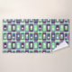 This towel set has a light purple washcloth, a darker purple hand towel, and a bath towel with a mid-century modern design of rectangles stack three thick in cool colors of blues, greens, and purples on a field of white. Want the same design with different colors? Message me.