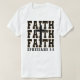 Dieser weiße T - Shirt enthält das Wort "FAITH", das dreimal vertikal in einem kühnen, schwarzen Schriftart im Kollegialstil mit orangefarbener Kontur gestapelt wurde. Der Buchstabe 'T' in der Mitte "FAITH" wird durch ein durchgehendes Christliches Kreuz ersetzt, das einen zentralen Brennpunkt schafft. Unter den gestapelten Wörtern wird der Bibelvers "EPHESIANS 2:8" in einem kleineren, schwarzen Sans-Serif-Schriftart gedruckt. Dieses Design verbindet Text und Symbol kraftvoll, um einen Christlichen Grundgedanken auszudrücken.