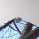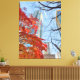 Im Vordergrund steht ein lebhafter Ahornbaum in Rot und Orange, dessen Blätter in Herbstfarben erstrahlen. Der Baum umrahmt den Blick auf einen großen, modernen Wolkenkratzer, dessen Glasfassade den blauen Himmel reflektiert. Seltene Zweige eines anderen Baumes reichen zum Himmel hinauf und verleihen ihm ein Gefühl von Tiefe und Perspektive.