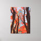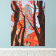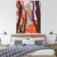 Das Bild zeigt eine lebhafte Herbstszene mit einem hohen Wolkenkratzer, der durch ein Kronleuchter aus feuerroten Blätter schaut. Die Zweige der Bäume mit ihrer rauen braunen Rinde bilden einen Rahmen für das moderne Gebäude und schaffen einen auffallenden Kontrast zwischen Natur und urbaner Architektur. Die Blätter sind eine Mischung aus tiefer und orangefarbener Farbe, die der Komposition ein warmes und einladendes Ambiente verleiht.