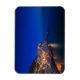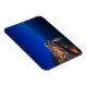 Ein rechteckiger Magnet mit der Kleinstadt Manarola, einem der fünf Cinque Terre Hügelstädte, errichtet auf einer Klippe mit Blick auf das Mittelmeer, mit den Lichtern während der Blauen Stunde am Anfang der Nacht in Ligurien, Italien.