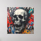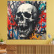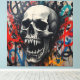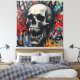 Ein gewagter Schädel hebt sich vor einem Hintergrund von Graffiti und abstrakten Formen hervor, gezeichnet in schwarzer Farbe an einer weißen Wand. Die Mischung aus scharfen Details und rauen Linien verleiht ihm einen auffälligen, edlen Look, während die verwitterte Wand ein robustes, urbanes Ambiente verleiht. Ideal für Fans von kühnen Street Art und rebellischen Designs.