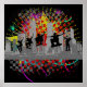 Eine Abbildung einer Skyline in Grau und einer Figur auf einem Skateboard, die eine Luftpirouette vor einem farbenfrohen Grunge Hintergrund macht.